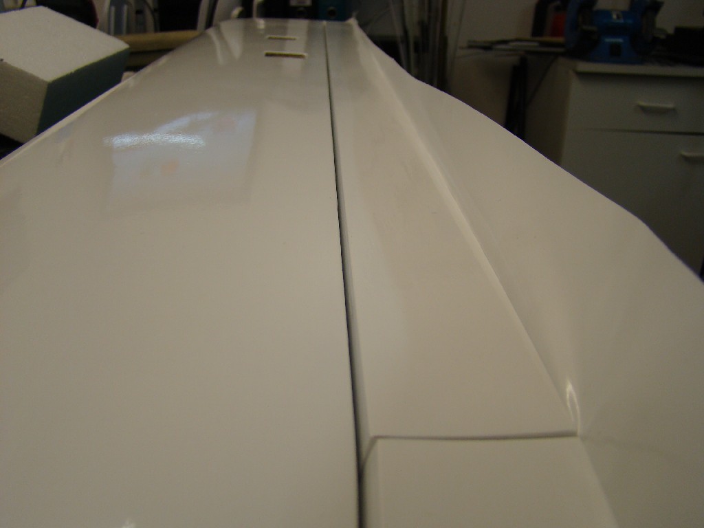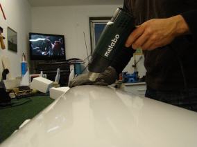 Bügeln der Fläche: Die Fläche muss vor dem Büglen absolut glatt sein. Daher schleife ich nochmal mit 180 Papier, natürlich in Richtung der Lüftströmung über die Fläche. Schleift man nicht von der Nasen- zur Endleiste schleift man automatisch Kanden in das Profil.