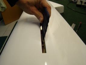 Dann wird die Folie mit einem Heißluftfön flächig erwärmt und die Folie mit einer Baumwollsocke festgerieben.