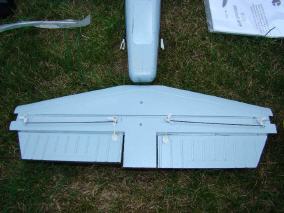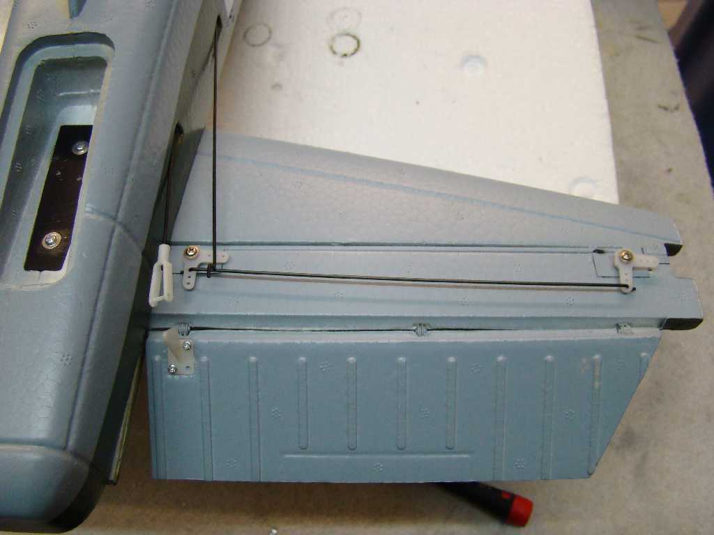 Das Höhenleitwerk wird auf dem Rumpf positioniert und mit 2 Schrauben von unten durch eine Serviceklappe festgeschraubt. Ganz ohne Verkleben eine feste Verbindung, da auch hier wieder Kunststoffteile im Styropor eingearbeitet sind (wie bei den Motorgondeln). Ebenso einfach werden beide Seitenruder aufgesteckt und wieder „nur“ verschraubt. Die bereits fertig eingebauten Anlenkgestänge werden bei eingeschalteter Anlage auf Neutralstellung gebracht und alle Gabelköpfe montiert. Damit beide Seitenruder funktionieren, sind auf der Unterseite des Höhenleitwerks bereits Umlenkhebel und Gestänge montiert.
