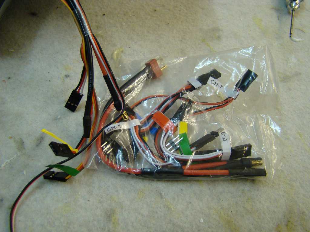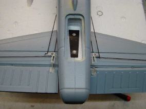 Alle Kabel des linken und rechten Kabelbaumes wurden aus der unteren Serviceklappe herausgeführt und mit den V-Kabeln entsprechend der farblichen Markierungen miteinander verbunden. Im Sender wird ein neuer Modellspeicher aufgerufen und die Kanäle bzw. Funktionen den Nummern auf den V-Kabeln zugeordnet. Weiterhin wird das Stromversorgungskabel für die Regler angeschlossen und in die Kabinenhaube geführt, wo später der Akku seine Position findet. Zum Abschluss wird der Empfänger in der Serviceklappe mit etwas Klettband befestigt und die Klappe mit Tesafilm geschlossen. Die beiden 2,4 GHz Antennen schauen einfach lose aus dem Rumpf.
