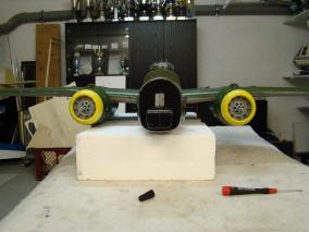 Nun geht es in den Endspurt. Die beiden Propeller werden mit jeweils 4 Muttern montiert, immer zwei Muttern zueinander gekontert und der Kunststoffspinner aufgeschraubt. Die Bugkanzel wird auf den Rumpf geklebt und unten an der Fahrwerksklappe geringfügig nachgearbeitet, damit diese nicht harkt. Dabei ist unbedingt auf das Dekor der Bugkanzel zu achten, sonst ist die „hübsche Figur“ unansehnlich! Die Kunststoffteile, wie MG’s und Antennen, werden mit Foam Speed verklebt. Die Kabelbäume in den Flächenhälften mit den beigefügten Abdeckungen versehen und der Flugakku unter der mit Magneten bestückten Kabinenhaube eingebaut. Der Schwerpunkt liegt bei Werksangabe 380 mm von der Spitze der Bugkanzel gemessen und stimmt im Seriensetup genau. Das Highlight dieses Kastens - ist zugegebener Maßen - das Einziehfahrwerk und leider, liebe Leser, kann man hier kein Video abdrucken. Nur so viel: Zuerst öffnen sich die drei Klappen, dann kommen alle Beine heraus. Unglaublich für diesen Preis! Dabei wird jedes Bein mit zwei Servos angesteuert, eins für die Klappe und eins für das Fahrwerksbein.